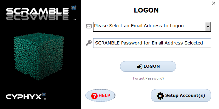 The LOGON form is used to select an email account previously setup in SCRAMBLE using the corresponding password that was created for it during the Setup Account. If the email account you want to access with SCRAMBLE is not listed, you can use 'Setup Account(s)' to add it to SCRAMBLE.