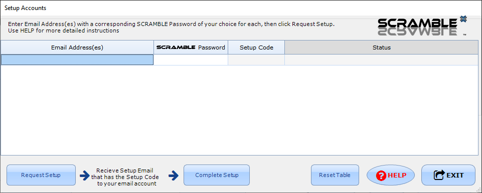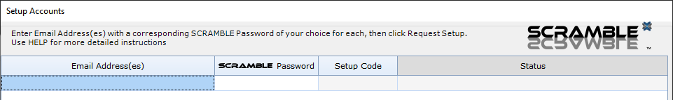- Once the Setup Email is received, you then enter the SCRAMBLE password you originally entered for the email address along with the Setup Code from the Setup Email you received to the email address.
